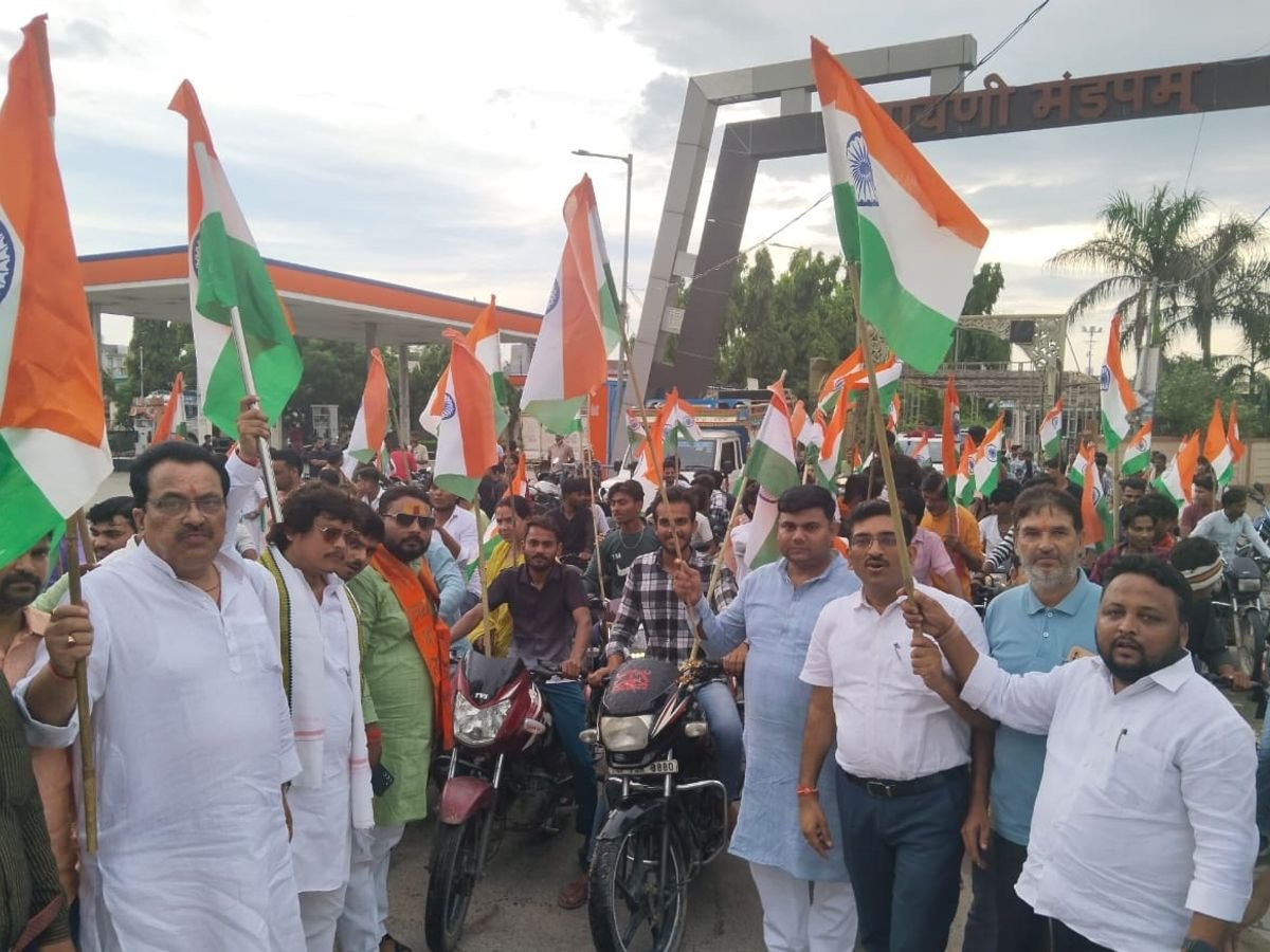 उत्तर प्रदेश के औरैया जिले में बिधूना। मंगलवार को कस्बे में भाजपा कार्यकर्ताओं की तिरंगा यात्रा निकली। यात्रा में वरिष्ठ नेताओं के साथ युवा भी शामिल हुए। दुर्गा मंदिर से तिरंगा यात्रा का शुभारंभ किया गया।यात्रा के दौरान पुलिस द्वारा यातायात को भी कुछ समय के लिए रोका गया। इस यात्रा में संदीप शाक्य, अमित मिश्रा, डॉ. घनश्याम सिंह सेंगर, आशीष वर्मा, लाल सिंह सेंगर, अजयपाल कुशवाह, भानु ठाकुर व अन्नू त्रिवेदी आदि कार्यकर्ता मौजूद रहे।